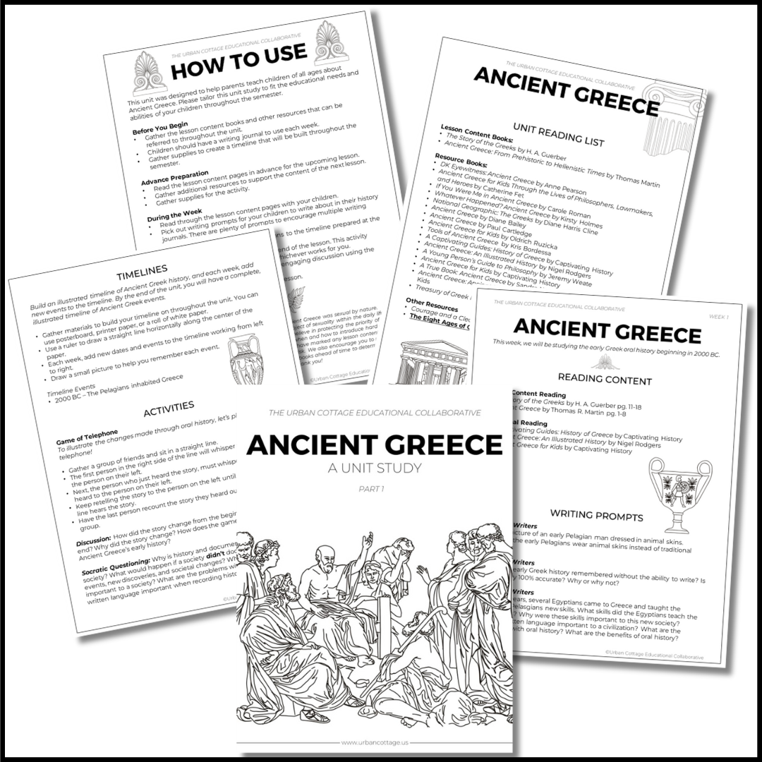Dive deep into the fascinating history of ancient Greece guided by our Ancient Greek History unit, designed to teach all age groups. This first half of the unit includes nineteen lessons, a resource book list, writing prompts for all levels of writing, engaging hands-on activities, Socratic questioning for group discussions, and more!